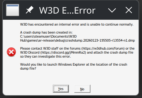 Hi guys, I am trying to migrate over to Linux and wanted to test setting up W3Dhub games on Linux. 'Cyberarm's Linux Friendly W3D Hub Launcher' seems to be working pretty good and I was able to get all the available games to work except for Apocalypse Rising. For whatever reason, every time I try to launch it I immediately get 'W3D has encountered an internal error and is unable to continue normally'. It's pretty weird since all the games are using the same WINE configuration, and all the other games work. Anyone have any ideas I should look into? Can anyone help me analyze the crash log to get any ideas? When does the game crash? Immediately at launch What game crashes? (because we have quite a few here) Apocalypse Rising Can you reproduce the crash by repeating a certain action? (If so, please describe the steps in detail) Yes, launching the game via Cyberarm's Linux Friendly W3D Hub Launcher causes the game to immediately crash Brand of PC (and model numbers are great too if you can locate them) I built it What Operating System do you run? (Windows 7, Windows 10, or whatever) CachyOS (Linux) What Processor do you have? 9700K What GPU (video card) do you have? 2060 RTX Super How much RAM do you have? 32 GB How large is your hard drive(s)? Is there enough free space available? 4tb What Antivirus application (if any) are you running? none Anything else you feel we should know about your system. Are you running any "add-ons" like Fraps or other recording software, modification to the game of ANY kind, etc. No. How long has the problem been occurring? Did a certain game update cause it? It's always happened since I installed it. Have you modified your game in any way? Mods are cool, but be honest with us if the problem could possibly be rooted in your own experimentation. We have all broken a game while fooling with it at some point, so no shame. We just need to know about it in order to help fix it. No. crashdump.20260123-194132-r13554-n1.dmp